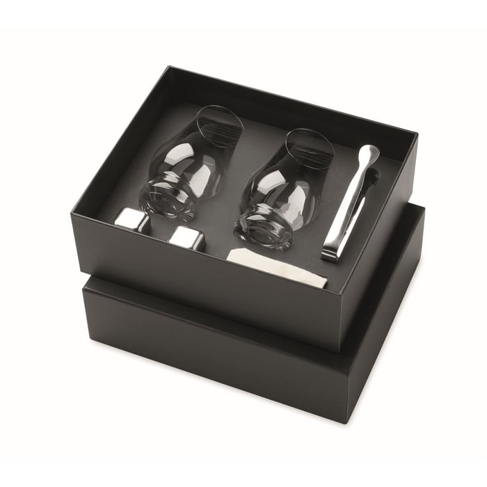 Set van 2 tasting glazen (200 ml) voor whisky of andere likeuren, 2 herbruikbare roestvrijstalen ijsblokjes, tang en katoenen opbergzakje voor ijsblokjes.