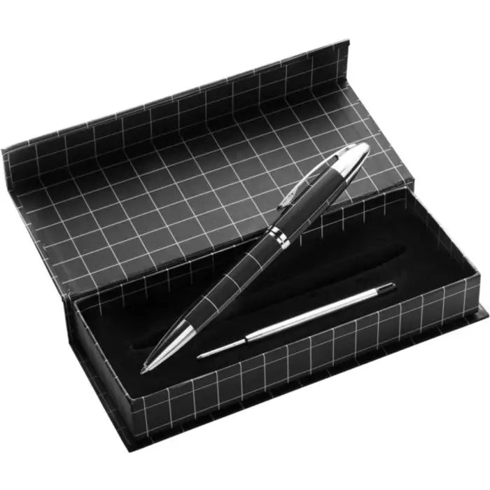 Balpen van metaal met lakafwerking. Verpakt in een luxe pennenetui met magnetische sluiting. Zwarte inkt en extra vulling.