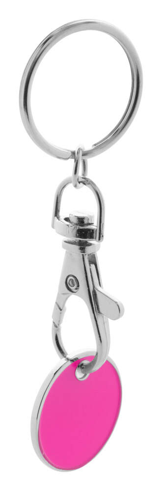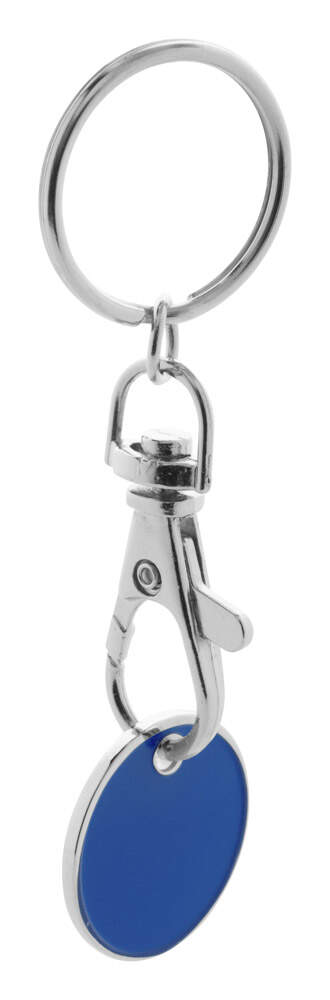 Metal sleutelhanger met winkelwagenmunt. Één zijde van het muntje is gekleurd de andere kant heeft een gegraveerd winkelwagentje. Formaat munt: diam. 23x1,7 mm.